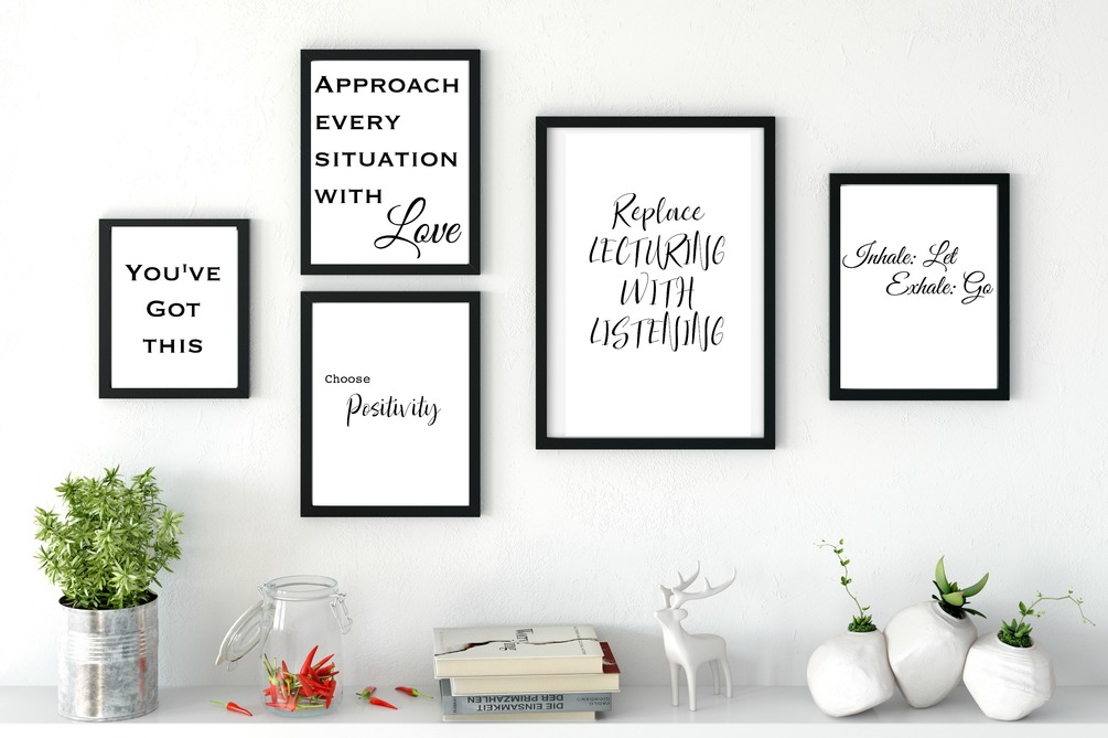 Six affirmations rooted in positive parenting to print off and display as you so choose. Includes phrases, "You've Got This," "Hug it Out," "Choose Positivity" "Approach Every Situation With Love," "Replace Lecturing with Listening," and "Inhale: Let Exhale: Go."